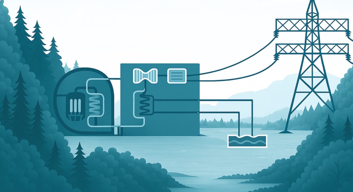 Een kerncentrale gebruikt de warmte die vrijkomt bij de splijting van splijtstof, zoals uranium, om elektriciteit op te wekken. Dit gaat als volgt: Binnen de centrale bevinden zich staven van uraniumoxide in een vat met water (1 en 2). Wanneer de uraniumkernen in deze staven splijten, komt er warmte vrij, waardoor het water heet wordt. Dit hete water stroomt naar een stoomgenerator (3), waar het zijn warmte afgeeft aan een tweede watercircuit dat stoom produceert. De stoom drijft een turbine aan (4), die een generator (5) aandrijft om elektriciteit te produceren. Na de turbine condenseert de stoom in een condensor (6) weer tot water, doordat hij warmte afgeeft aan koelwater uit het koelwatersysteem (7). Bij kerncentrales zijn er drie aparte, gesloten, circuits, zodat het water uit de reactor niet in de turbine of koelvoorzieningen komt. Daarmee blijft het primaire (reactor)circuit gescheiden en wordt verspreiding van radioactieve stoffen voorkomen. Alles bij elkaar leidt dit proces tot een veilige, stabiele en efficiënte productie van elektriciteit.